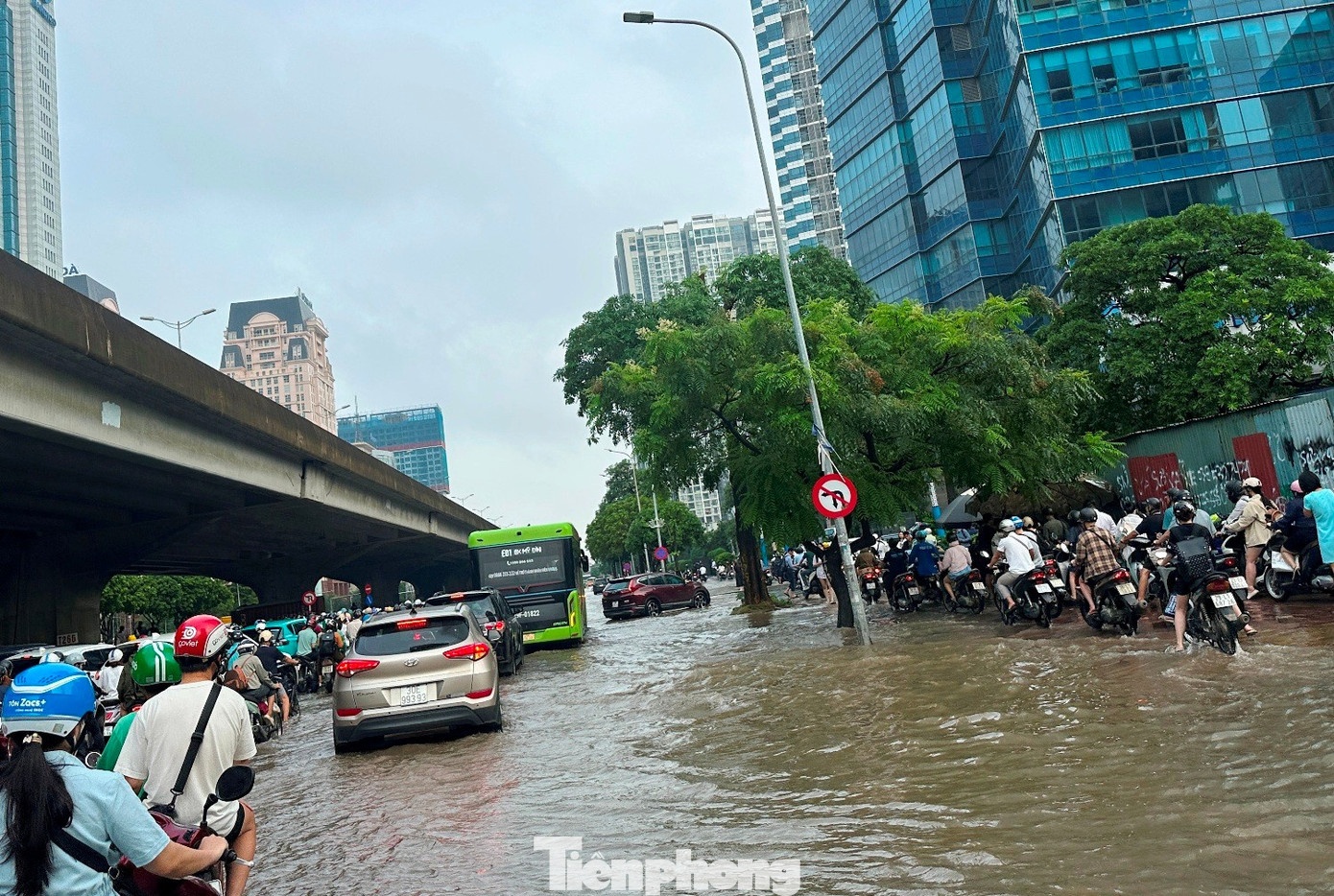 Đường Phạm Hùng (Vành đai 3) qua các tòa nhà Keangnam, bến xe Mỹ Đình, cầu vượt Mai Dịch... hơn nửa lòng đường hướng Mai Dịch ngập sâu trong nước, nhiều người dân phải lội nước dắt xe.