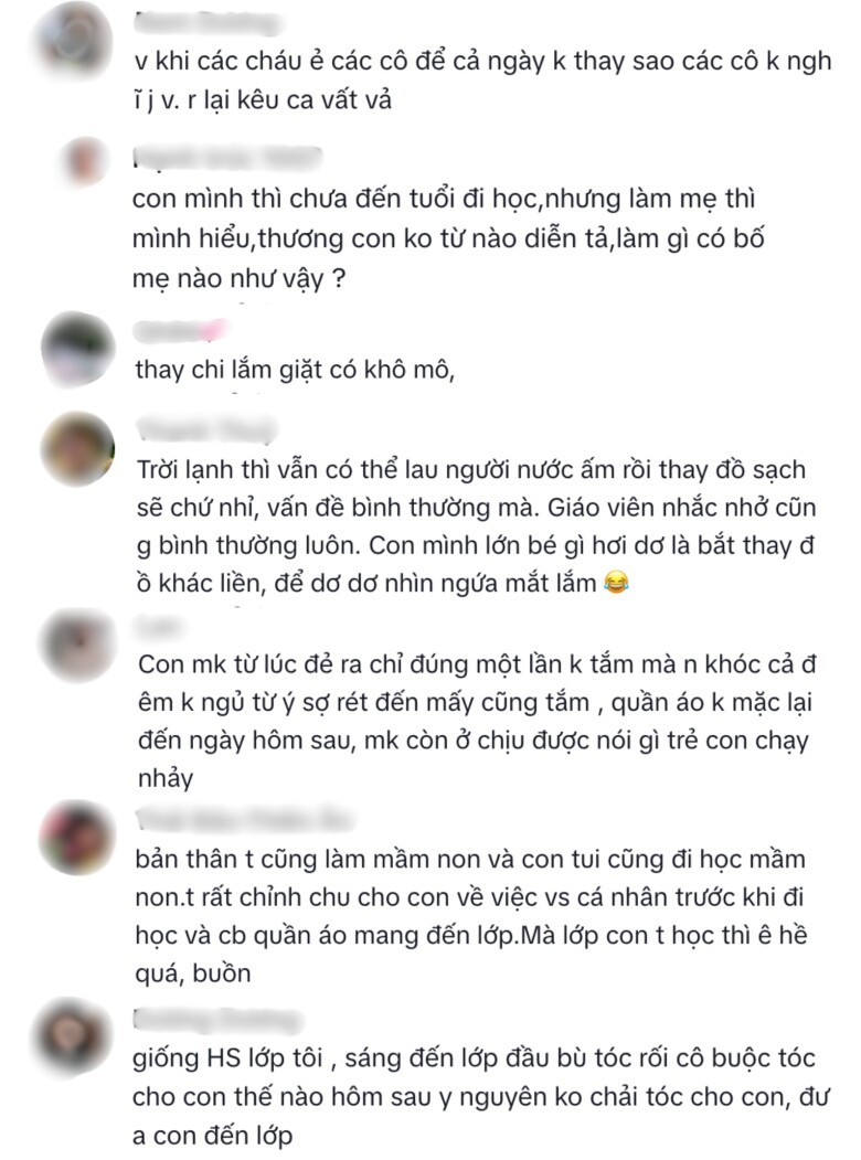 Tuy nhiên, quan điểm của cô giáo đã không nhận được sự đồng tình từ một số phụ huynh. Họ đã vào "combat" trong phần bình luận, đưa ra nhiều lý do cho việc không thay quần áo cho con. Một số người cho rằng mùa đông đến, trời mưa và gió ẩm khiến quần áo chưa kịp khô, trong khi những người khác lại phê phán, lên tiếng bức xúc và trách cô giáo đã không cố gắng giúp đỡ trong việc dạy dỗ vệ sinh cá nhân cho trẻ.