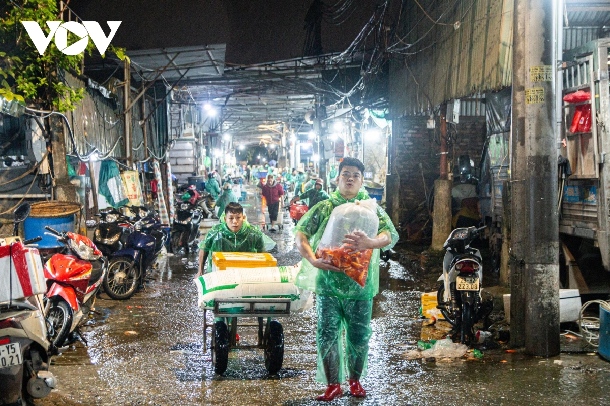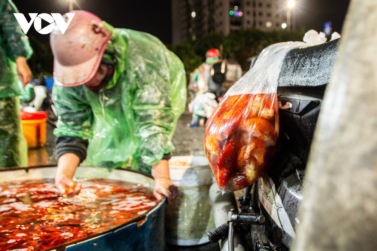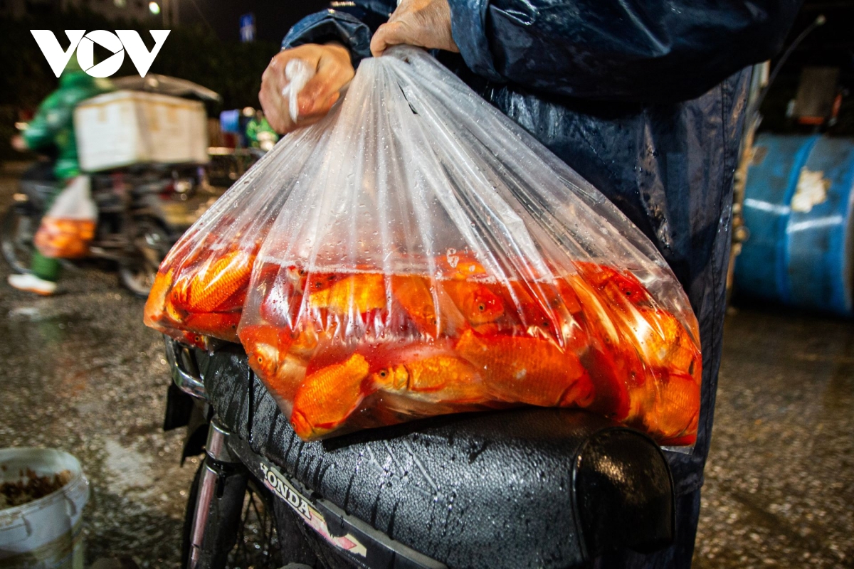 Đội mưa, vượt rét, các tiểu thương mua buôn tập trung về chợ cá Yên Sở để lựa chọn cá chép đỏ mang đi phân phối cho các chợ dân sinh. Dù mưa nặng hạt, rét đậm các tiểu thương vẫn làm việc liên tục, không ngơi tay. Để chủ động nguồn hàng, theo các tiểu thương đã đặt cá từ rất sớm tại những vùng nuôi lớn như Phú Thọ, Hải Phòng, Ninh Bình… rồi vận chuyển về Hà Nội tiêu thụ.