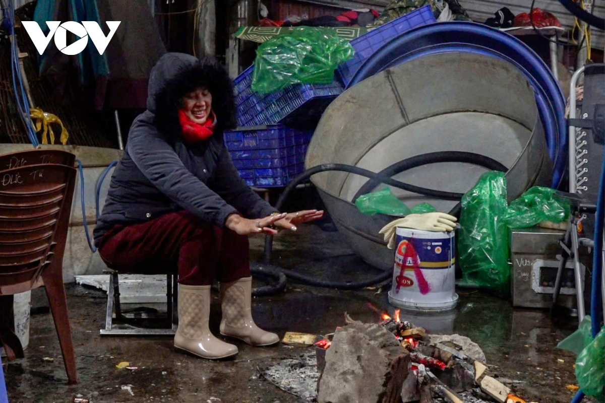 Chống chọi với thời tiết rét buốt, tiểu thương trùm khăn kín đầu, đi ủng, đốt lửa sưởi ấm ngay tại sạp hàng. Tranh thủ hơ tay bên bếp lửa khi đã bán hết cá từ sớm, chị Nguyễn Thị Huyền, chủ cơ sở kinh doanh cá tại chợ cá Yên Sở, cho biết: “Những ngày giáp Tết, ngày nào tôi cũng đi từ 5 giờ chiều đến 6 giờ sáng hôm sau. Hai hôm nay trời lạnh hơn hẳn nên làm việc cũng vất vả hơn, nhưng quen nghề rồi thì vẫn phải cố gắng thôi”.