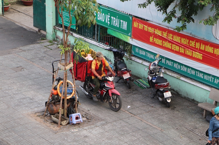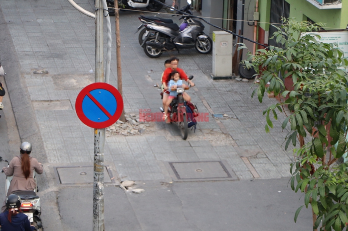 Người phụ nữ chở 2 con nhỏ leo vỉa hè, chạy ngược chiều trên đường Quang Trung.