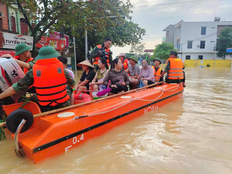 Khẩn trương đưa người dân ra khỏi các khu vực bị ngập sâu. (Ảnh: QUANG ĐẠO)