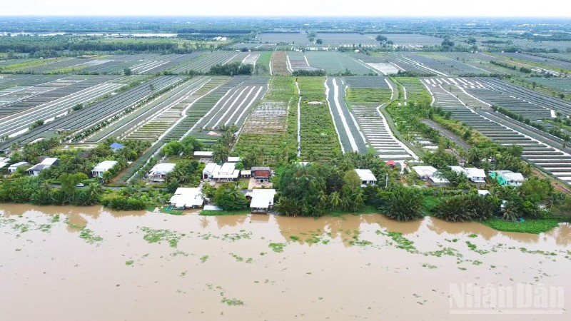 Nhiều ngôi nhà khang trang bên cánh đồng khóm Cầu Đúc ở xã Hỏa Lựu nhìn từ trên cao.