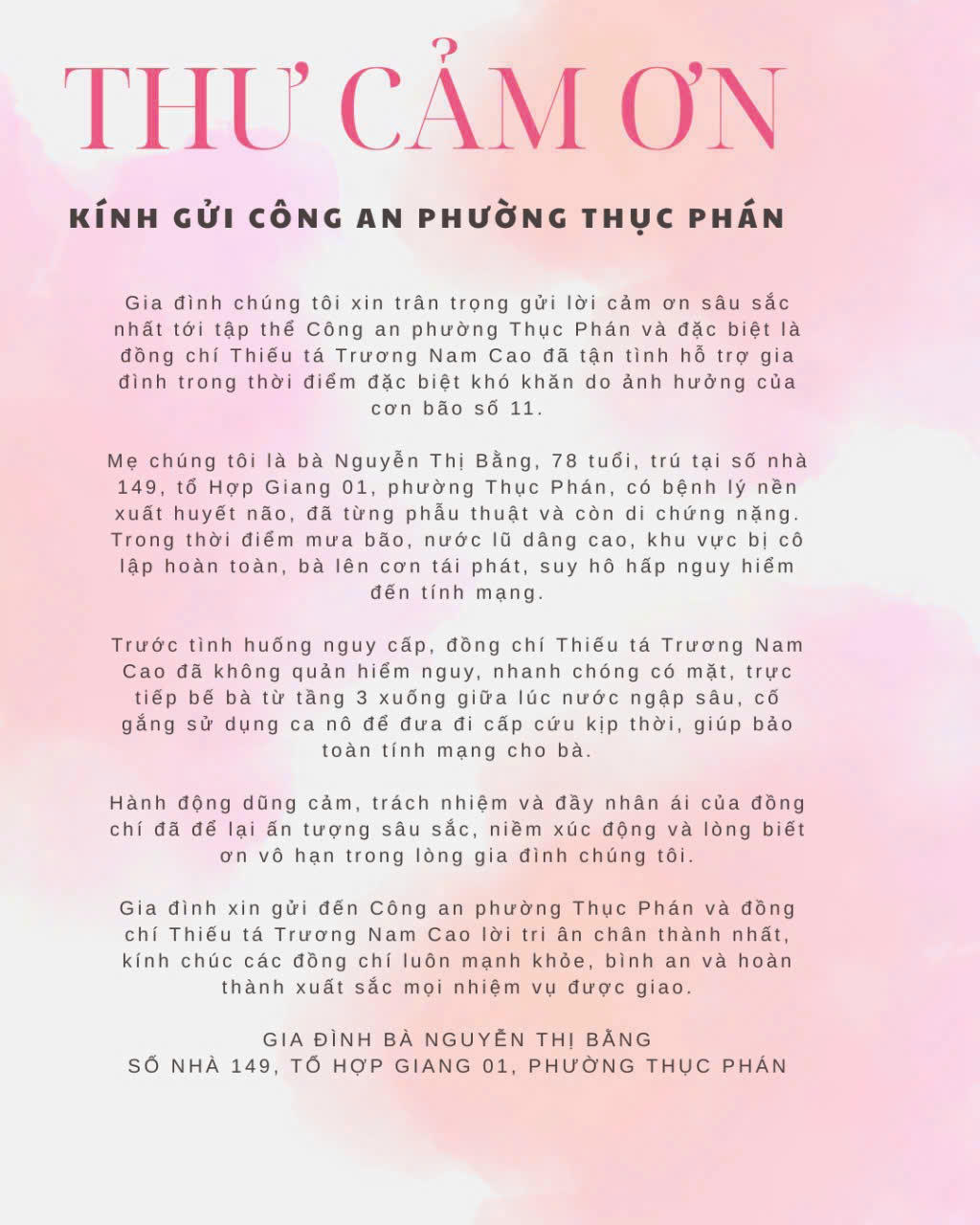 Thư người dân gửi cảm ơn Chính quyền, lực lượng Công an phường Thục Phán - Cao Bằng