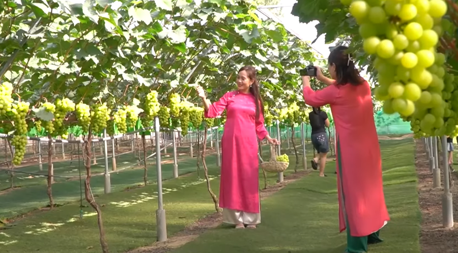 Chị Trần Thanh Hà, du khách đến tham quan chia sẻ đây là lần đầu tiên chị được chứng kiến một mô hình nho quy mô ngay trong nhà màng: “Không gian rất sạch sẽ, mát mẻ, bước vào đã thấy những chùm nho trĩu xuống nhìn rất thích mắt. Tôi ấn tượng vì nho ở đây giòn, thơm và ngọt tự nhiên hơn nhiều so với những loại mua ngoài thị trường”.