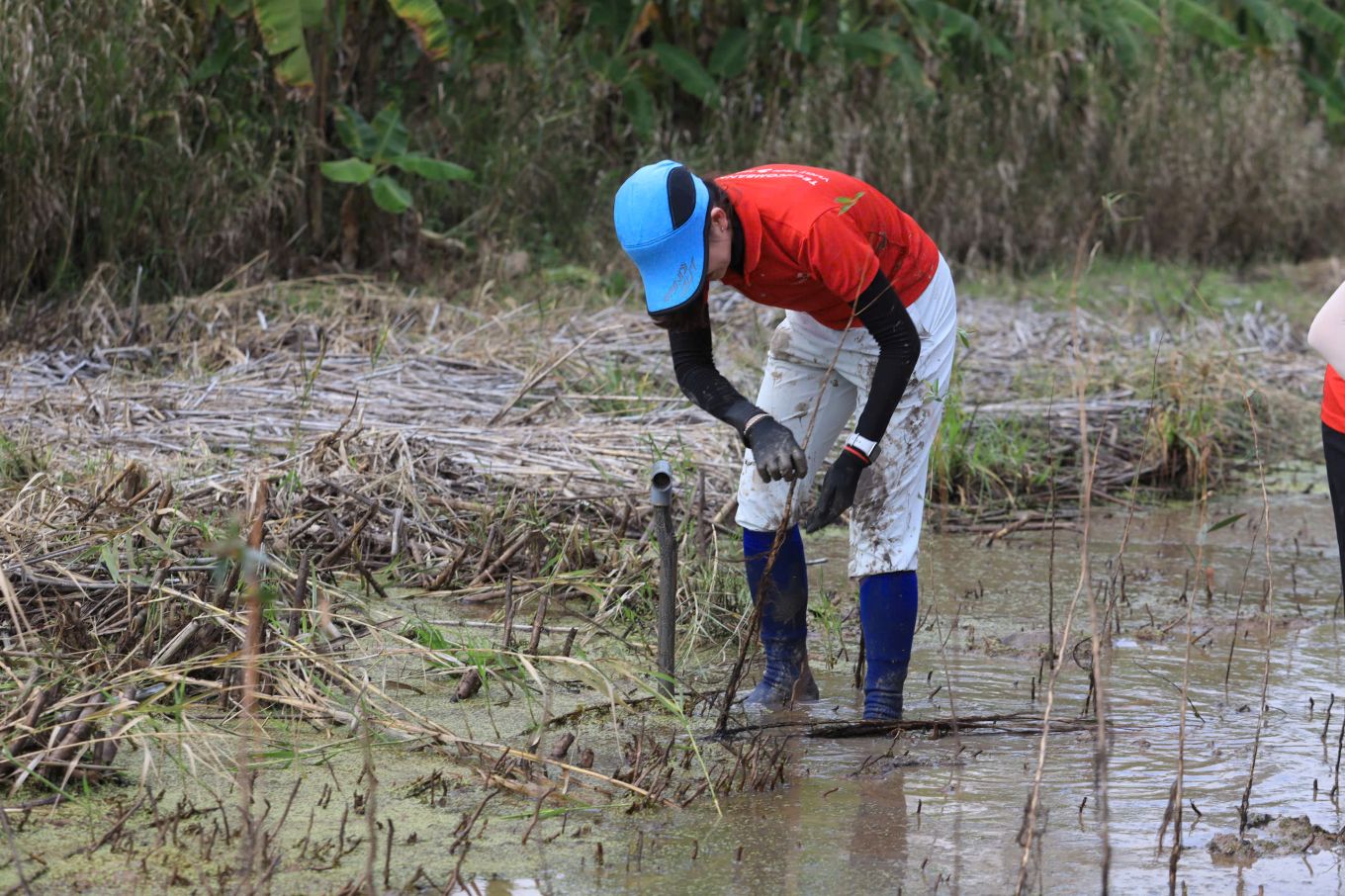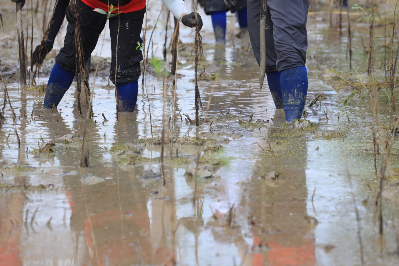 Chị Trần Ngọc Hà (bên phải) chia sẻ: “Tôi đã có dịp tham gia trồng cây ở nhiều nơi, mỗi lần đều mang lại một cảm xúc rất riêng. Lần này khiến tôi ấn tượng nhất khi được trồng cây dưới nền đất bùn. Tôi hy vọng cây mình trồng sẽ phát triển tốt và góp một phần nhỏ giúp môi trường xanh hơn.”