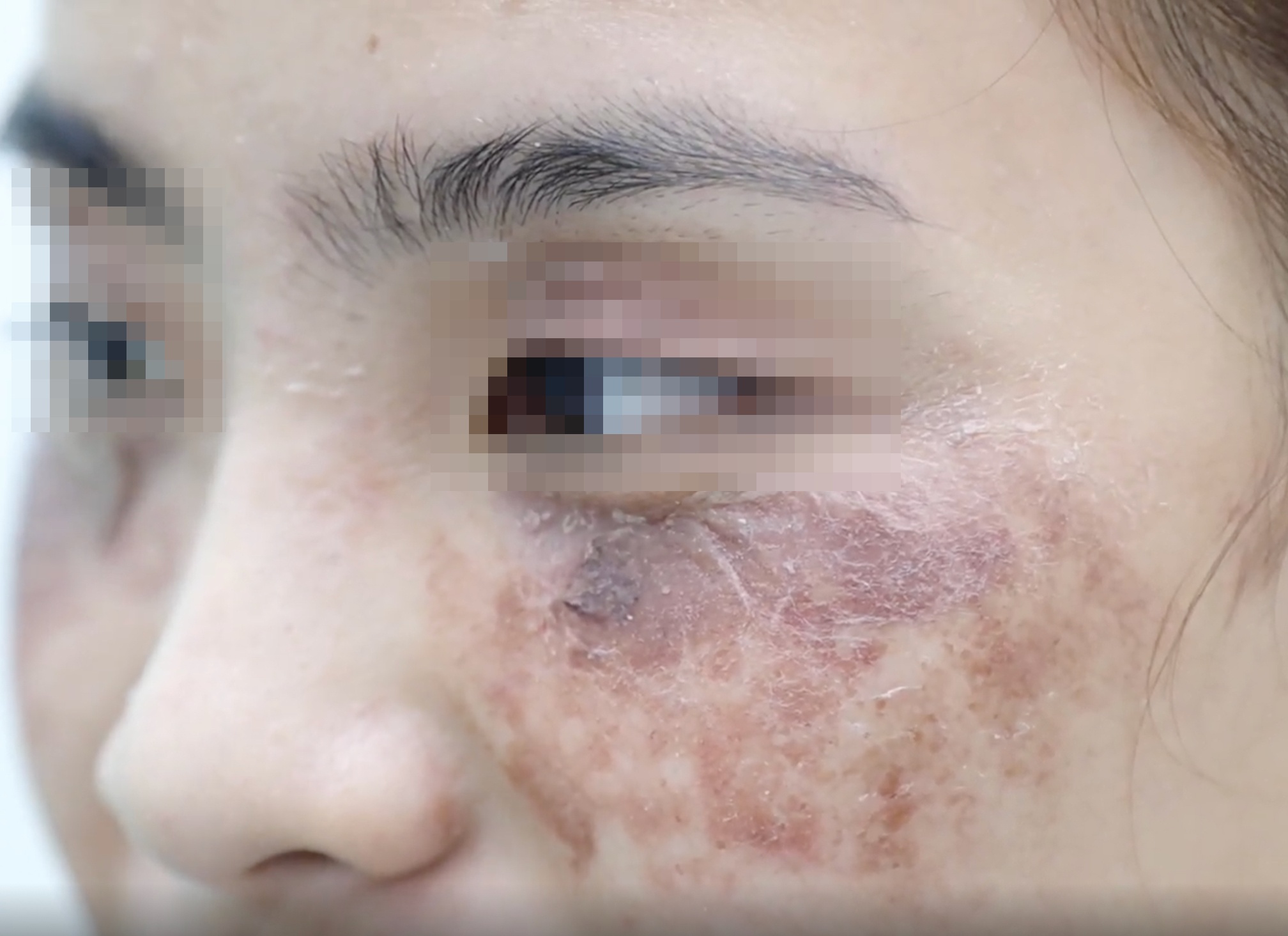 Da của chị Thanh Hằng bị sạm, bong tróc sau thời gian dùng kem trị nám kém chất lượng. Ảnh: BVCC.