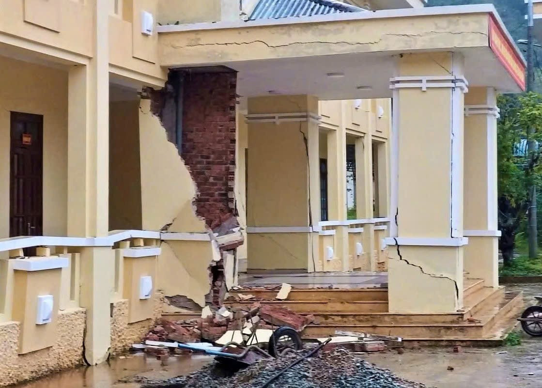 Các vết nứt tại trụ sở xã vẫn có dấu hiệu mở rộng, từng mảng bê tông rớt ra bên ngoài khiến tòa nhà nghiêng hẳn. Theo lãnh đạo xã, nếu mưa lớn tiếp tục, có khả năng trụ sở sẽ sập đổ.