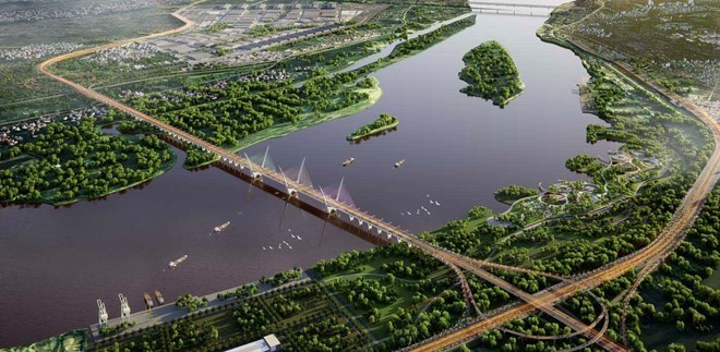 Để hiện thực hóa được định hướng lớn này, TP Hà Nội đang tập trung chỉ đạo và tổ chức triển khai thực hiện đồng bộ công tác quy hoạch khu vực bãi sông, ngoài đê sông Hồng, sông Đuống. (Phối cảnh cầu Tứ Liên).