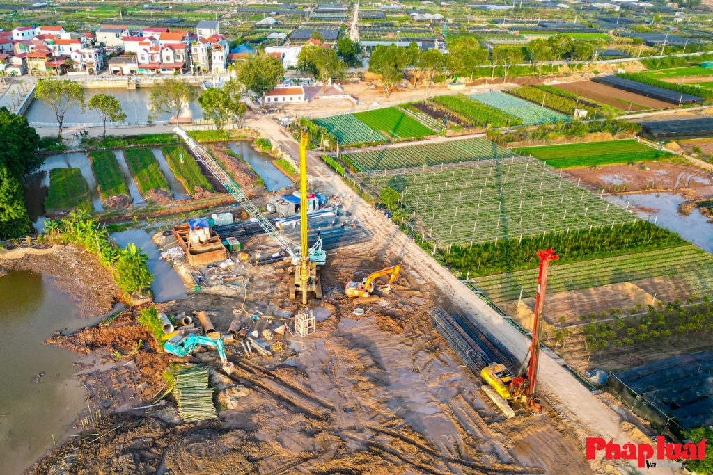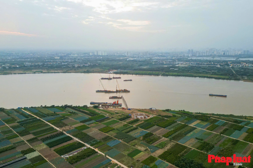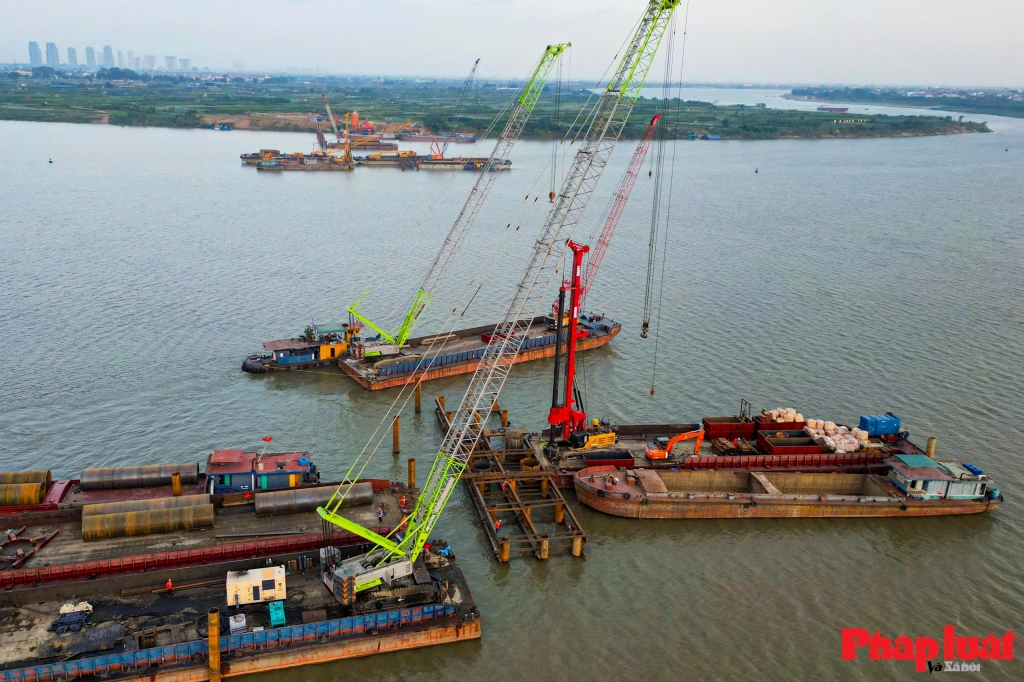 Trên lòng sông Hồng, hệ thống máy khoan cọc nhồi cỡ lớn đã được huy động để phục vụ thi công các trụ chính của cầu Ngọc Hồi, hạng mục kỹ thuật quan trọng quyết định khả năng chịu lực của công trình.