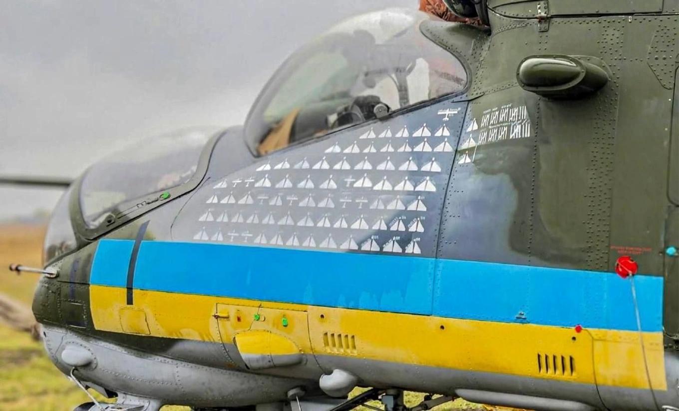 1 chiếc trực thăng tấn công Mi-24 của Ukraine gây chú ý khi xuất hiện với hàng loạt biểu tượng UAV Nga bị bắn hạ được vẽ trên thân.