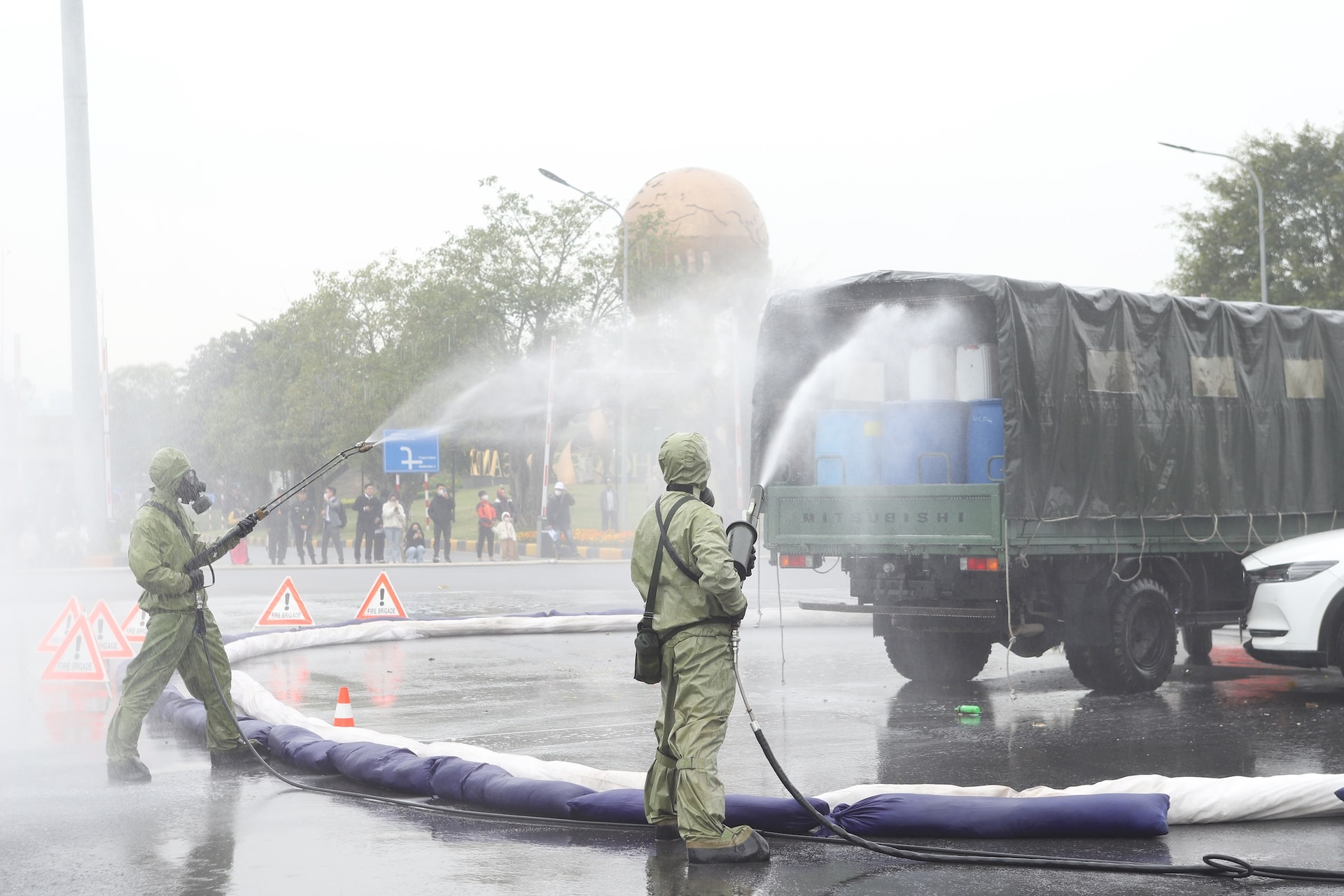 Triển khai đội hình xử lý sự cố hóa chất. Ảnh: TT