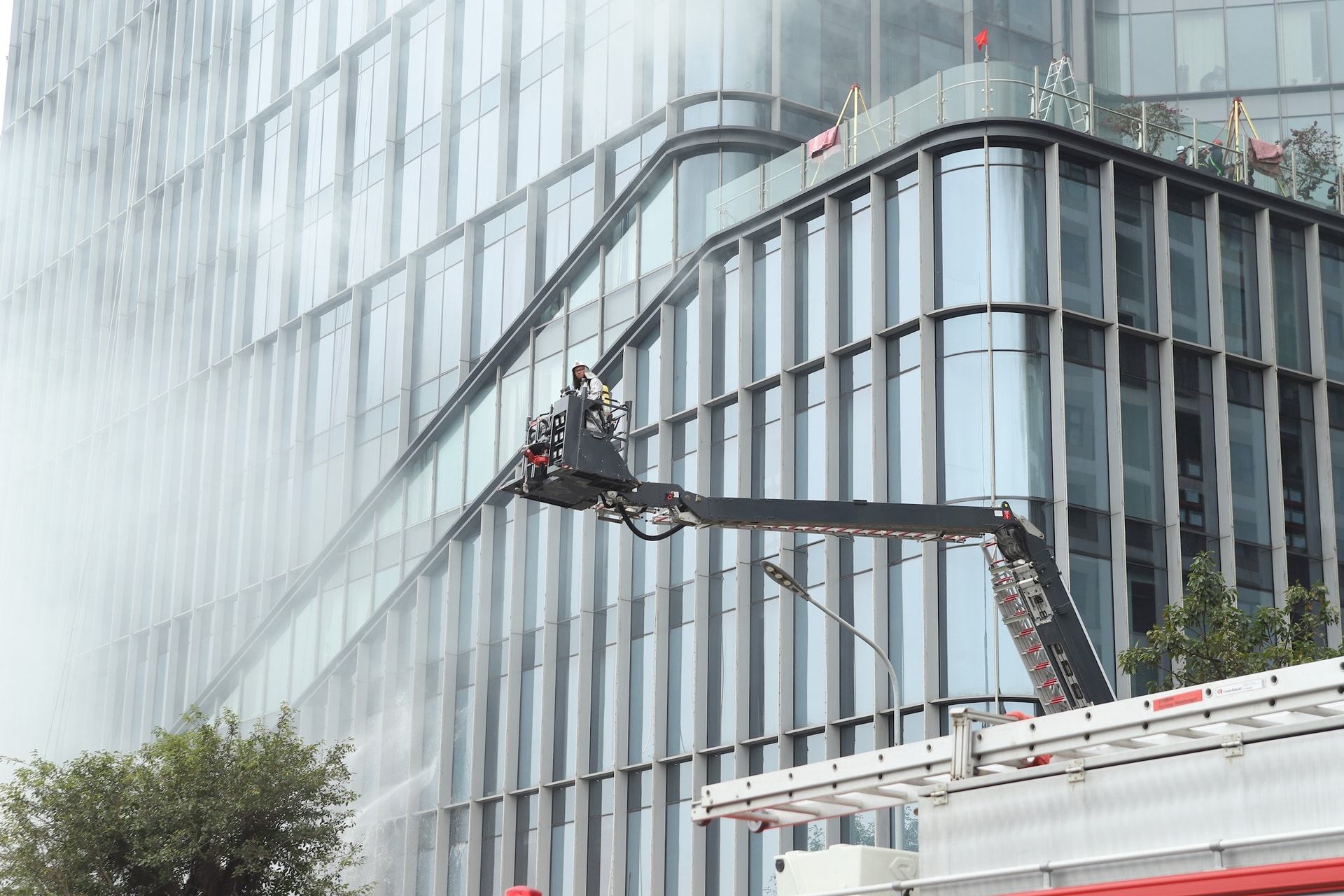 Triển khai xe thang tiếp cận các tầng cao của công trình. Ảnh: TT