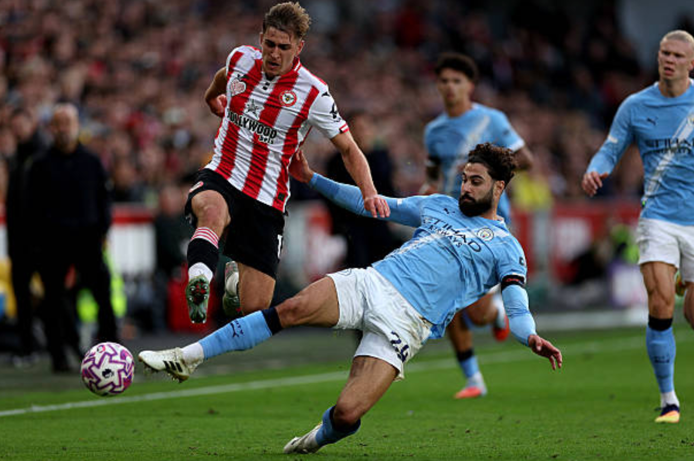 Phút 43: Brentford đang bị dẫn bàn, song sức phản kháng lại yếu ớt. Man City dễ dàng cầm bóng chủ động và điều tiết thế trận theo ý của họ. Đội khách cũng bình tĩnh chuyền qua lại, kéo giãn đội hình Brentford thay vì tấn công với tốc độ dồn dập như đầu trận.