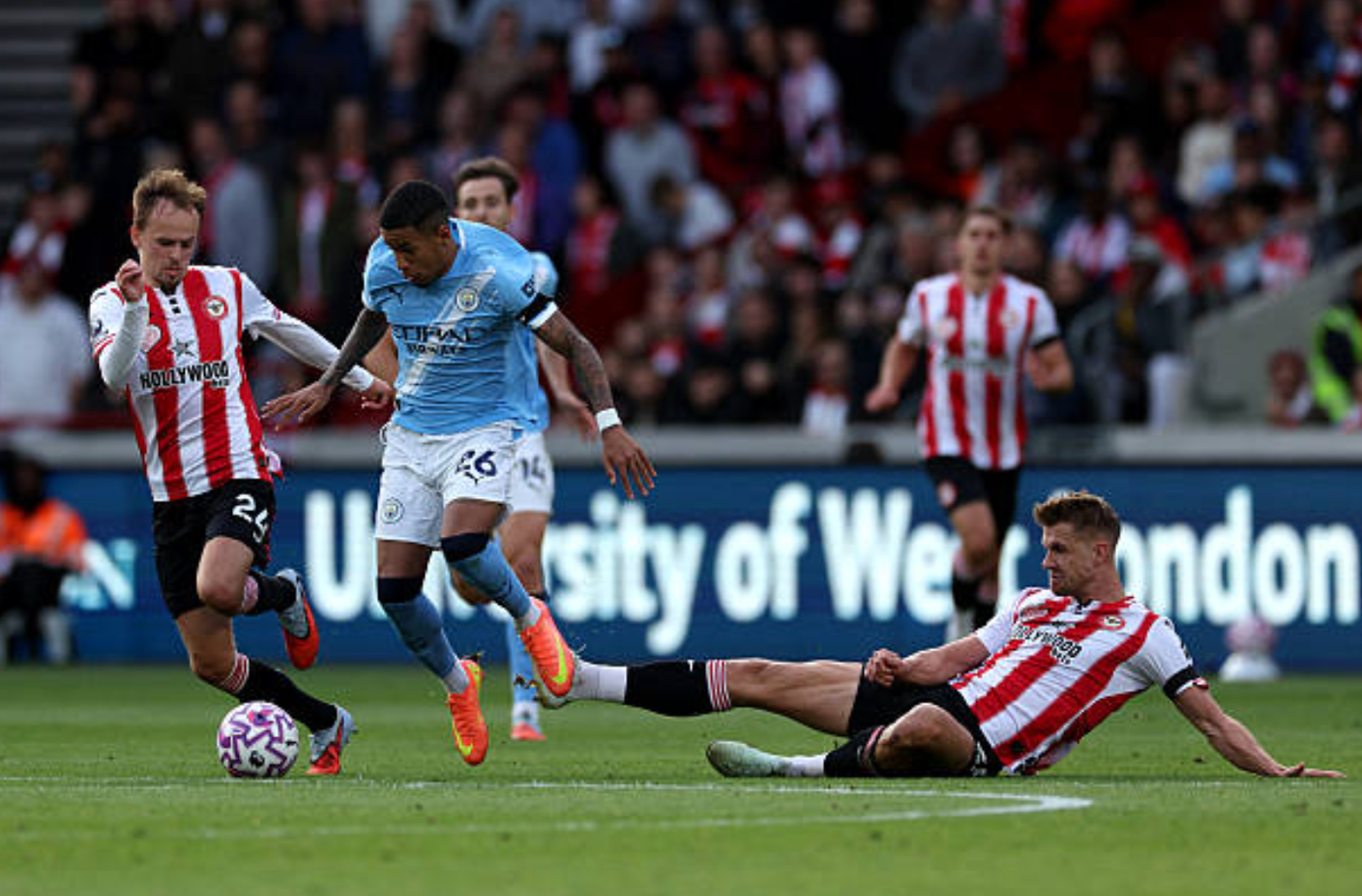 Phút 6: Tiền vệ Tijjani Reijnders của Man City cầm bóng xộc thẳng vào vùng cấm. Reijnders xoay xở trong vòng vây 4 cầu thủ Brentford, song không thể tìm thấy cơ hội dứt điểm.