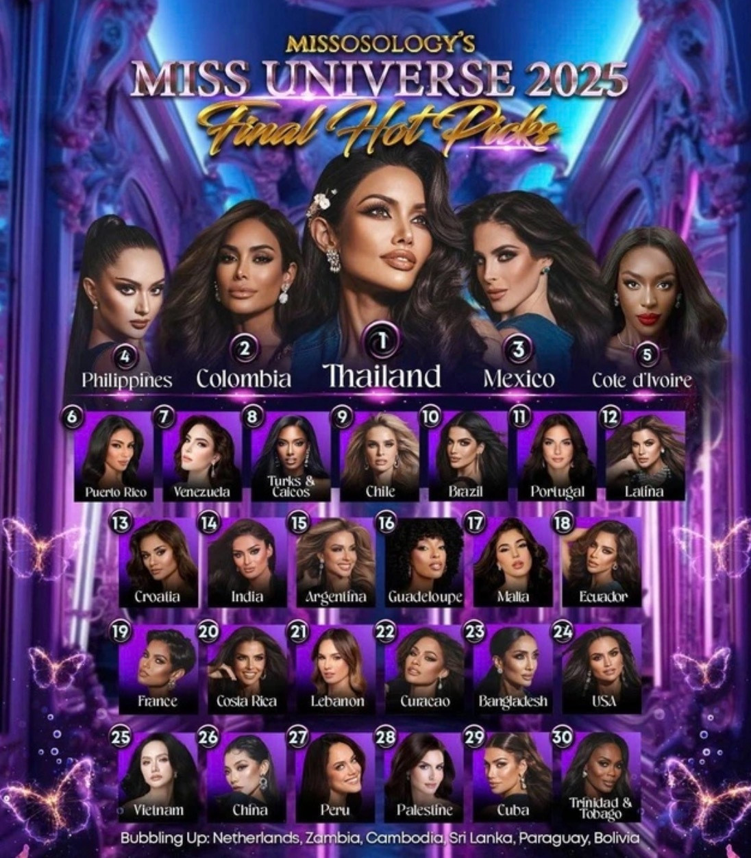 Theo bảng dự đoán cuối cùng của Missosology, mỹ nhân Thái Lan được chuyên trang này đặt niềm tin sẽ đăng quang còn Hương Giang khả năng vào top 30 chung cuộc.