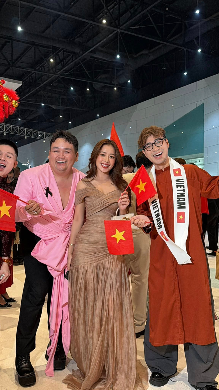 Hòa Minzy diện áo dài truyền thống, có mặt từ sớm ở sân khấu Miss Universe 2025 để cổ vũ cho Hương Giang. Bên cạnh Hòa Minzy là Long Chun.