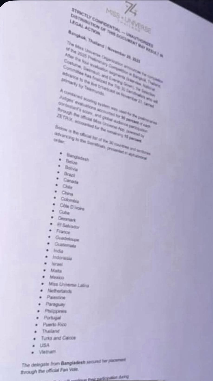 Mạng xã hội đang lan truyền hình ảnh được cho là danh sách top 30 chung cuộc. Danh sách đang bị rò rỉ này có tên của hàng loạt ứng cử viên sáng giá của Miss Universe 2025 như: Mexico, Brazil, Thái Lan, Philippines, Paraguay, Ấn Độ,... Đáng chú ý đại diện của Việt Nam - Hương Giang cũng có tên trong danh sách này. Tuy nhiên, danh sách đang được lan truyền này vẫn có nhiều điểm khiến fan nghi ngờ, điển hình như sự vắng mặt của hàng loạt cái tên nghìn máu như Colombia, Venezuela, Chile,...