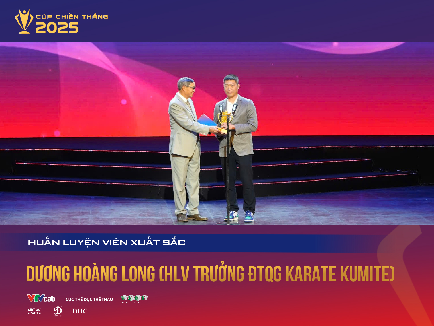 - HLV karate kumite Dương Hoàng Long giành giải thưởng HLV xuất sắc nhất của năm. Trong năm 2025, đội tuyển karate đã giành 2 HCV tại giải vô địch châu Á, 3 HCV SEA Games 33. Ông là HLV võ thuật đầu tiên được vinh danh trong 10 năm lịch sử Cúp Chiến thắng.