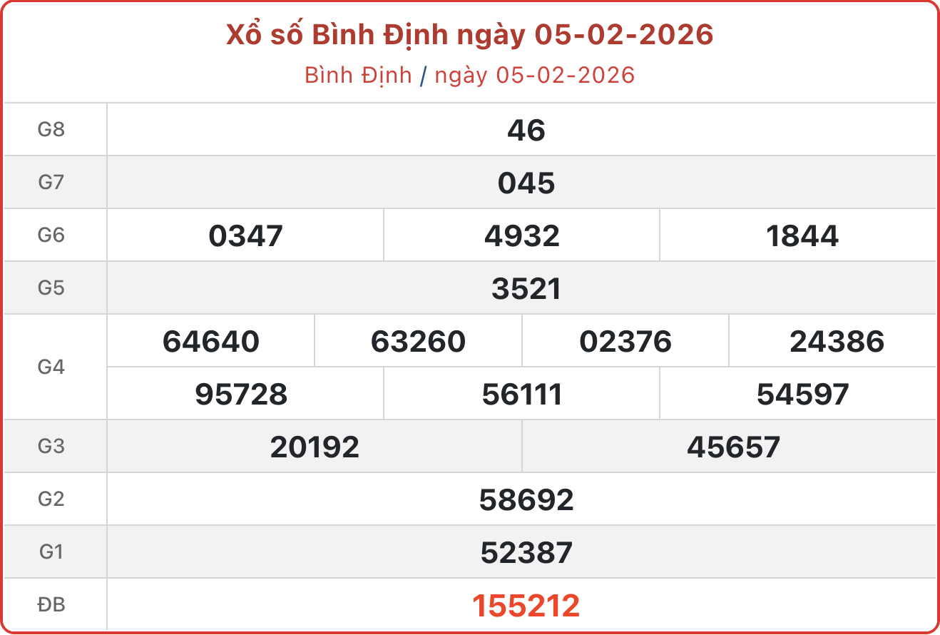 XSBDI 5/2, kết quả xổ số Bình Định ngày 5/2/2026.