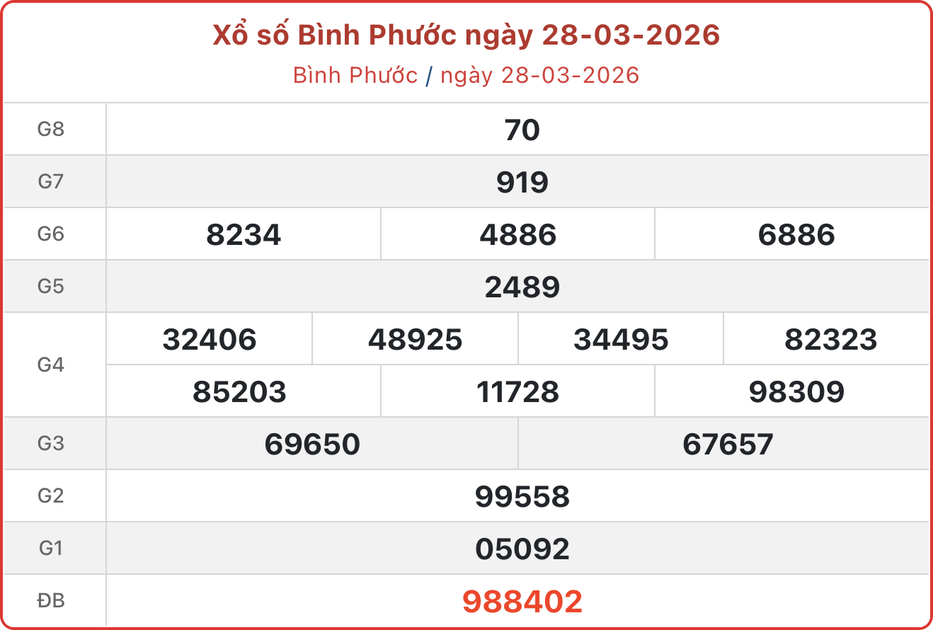 Công ty Xổ số kiến thiết Bình Phước công bố kết quả xổ số ngày 28/3/2026 với giải đặc biệt là 988402 và các hạng giải khác như sau: