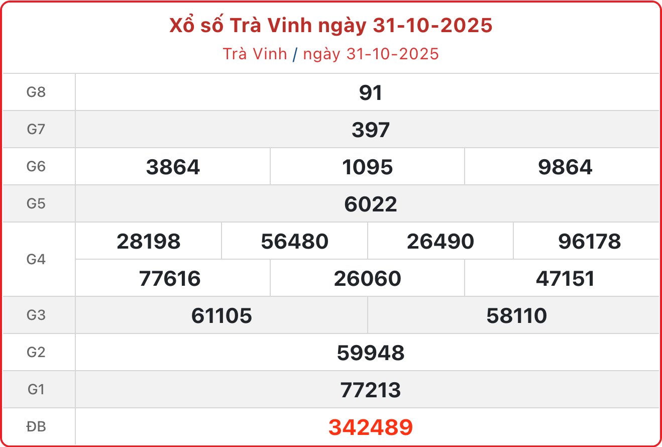 XSTV 31/10, kết quả xổ số Trà Vinh ngày 31/10/2025.