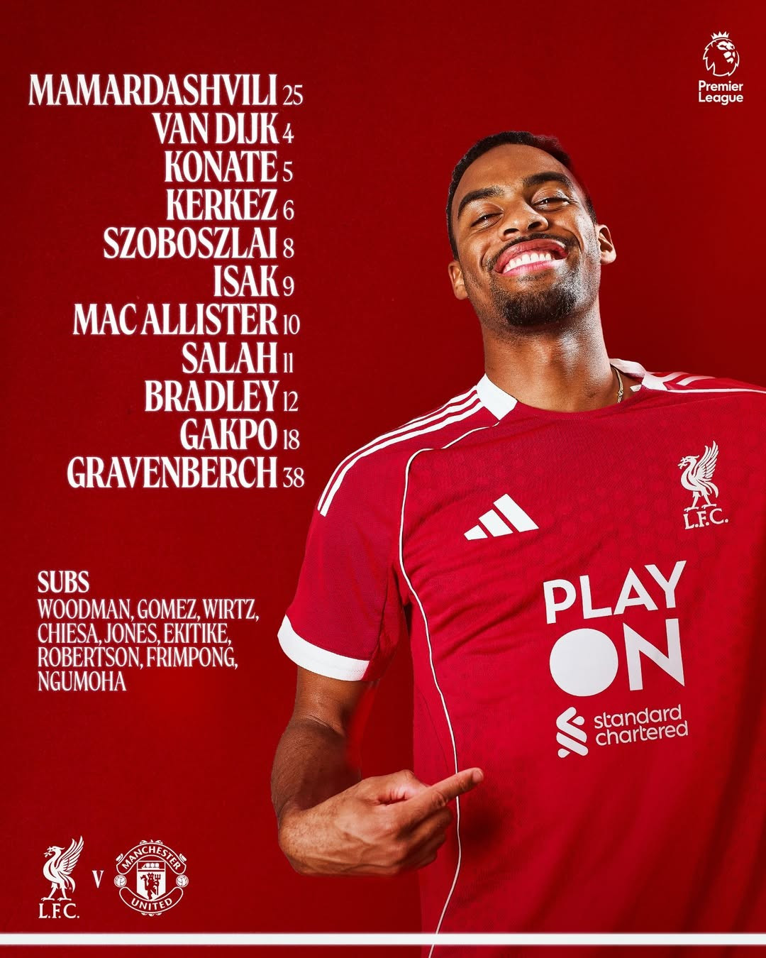 Mamardashvili; Bradley, Konate, van Dijk, Kerkez; Gravenberch, Mac Allister; Salah, Szoboszlai, Gakpo; Isak