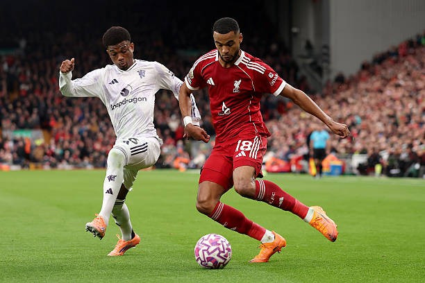 16': Diallo, người kiến tạo cho bàn thắng của Mbeumo, có khoảng trống bên cánh phải và băng lên đầy tốc độ, trước khi tung đường chuyền chéo sân hướng tới Dalot. Tuy nhiên, hậu vệ phải Bradley của Liverpool đã kịp thời cắt bóng, giải nguy cho đội chủ nhà.