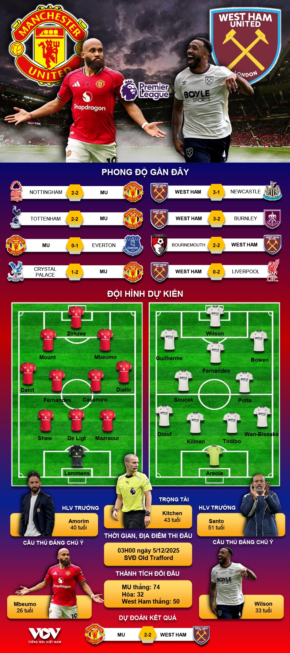 Trận đấu giữa MU vs West Ham tại vòng 14 ngoại hạng Anh 2025/2026 được đánh giá là màn so tài rất khó đoán. Cả hai đội đều không có được phong độ ổn định ở những vòng đấu gần đây dẫn tới vị trí trong bảng xếp hạng chưa được như mong đợi.