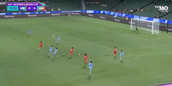 27': Bích Thùy lẻn xuống đối mặt thủ môn Ấn Độ. Cú đá của tiền đạo đội tuyển nữ Việt Nam không tốt, nhưng trước đó trọng tài đã phất cờ việt vị.