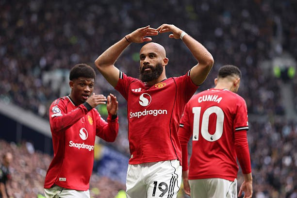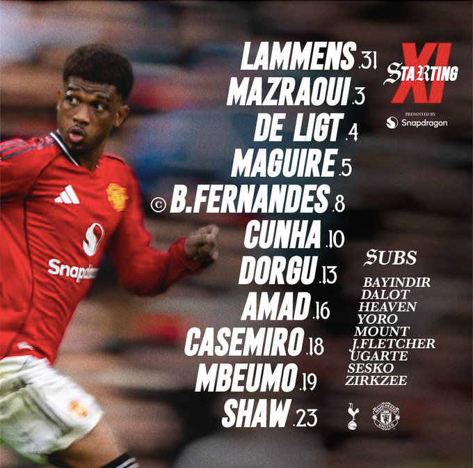 Lammens; De Ligt, Maguire, Shaw; Mazraoui, Casemiro, Fernandes, Dorgu; Mbeumo, Diallo; Cunha