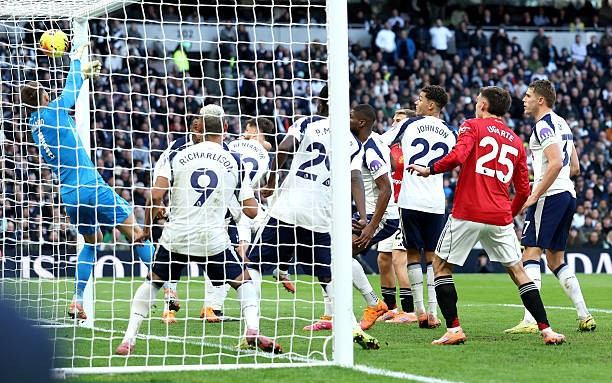 22': Cú dứt điểm của Cunha đưa bóng chạm một cầu thủ Tottenham và đi hết đường biên, mang về một quả phạt góc cho MU.