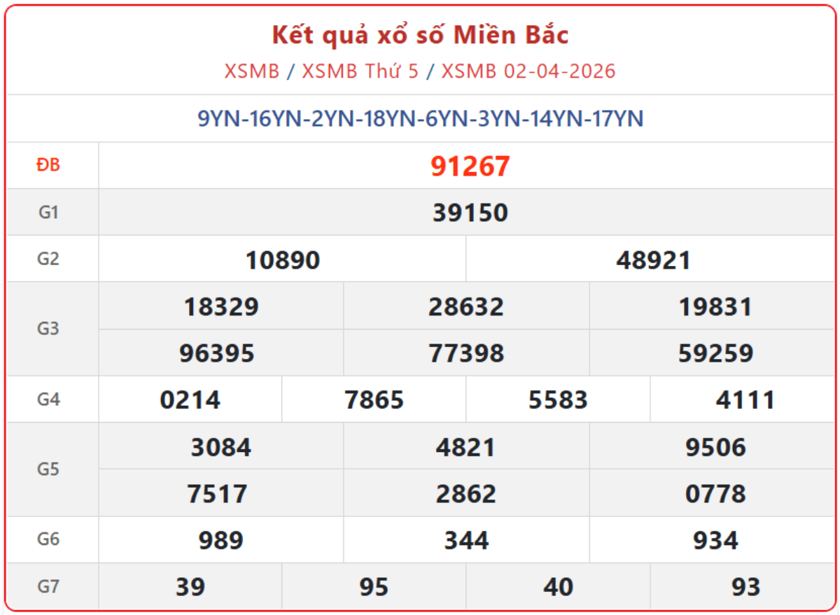 Kết quả xổ số miền Bắc ngày 2/4/2026, xem trực tiếp XSMB thứ 5 hàng tuần đầy đủ, chính xác nhất, được quay thưởng bởi Công ty xổ số kiến thiết Hà Nội (XSHN).