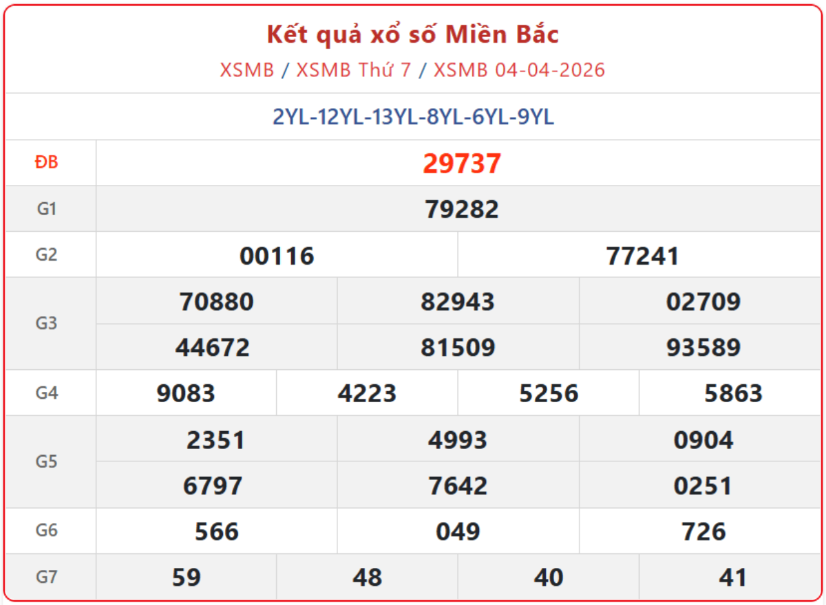 Kết quả xổ số miền Bắc ngày 4/4/2026, xem trực tiếp XSMB thứ 7 hàng tuần đầy đủ, chính xác nhất, được quay thưởng bởi Công ty xổ số kiến thiết Nam Định (XSNĐ).