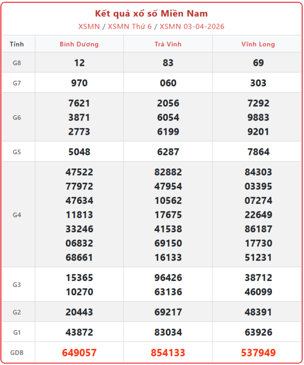 Kết quả xổ số miền Nam ngày 3/4/2026, KQXSMN thứ 6 hàng tuần đầy đủ, chính xác nhất.