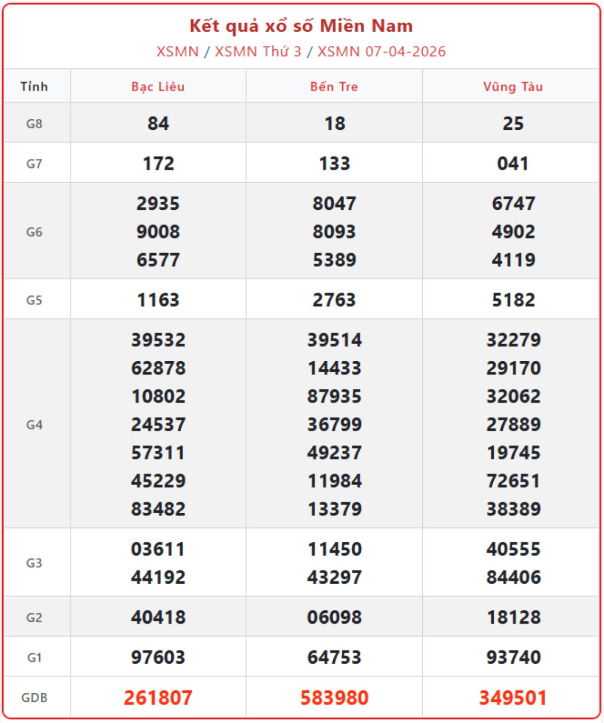Kết quả xổ số miền Nam ngày 7/4/2026, KQXSMN thứ 3 hàng tuần đầy đủ, chính xác nhất.