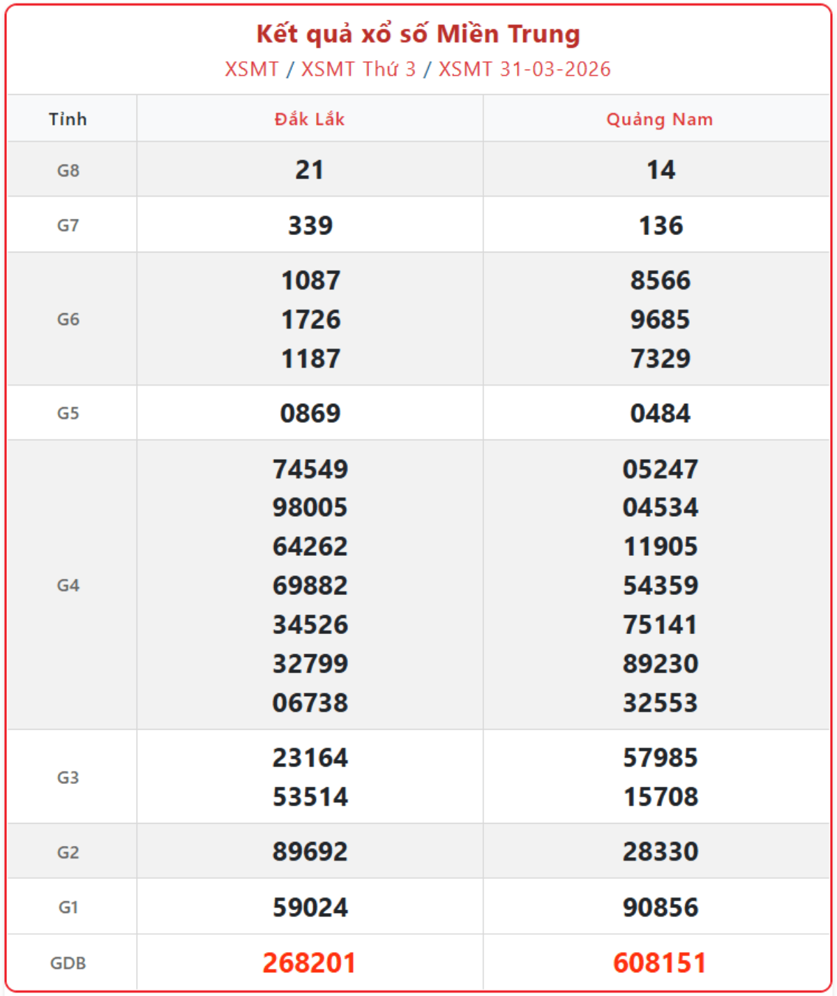 Kết quả xổ số miền Trung ngày 31/3/2026, cập nhật KQXSMT thứ 3 hàng tuần đầy đủ, chính xác nhất.