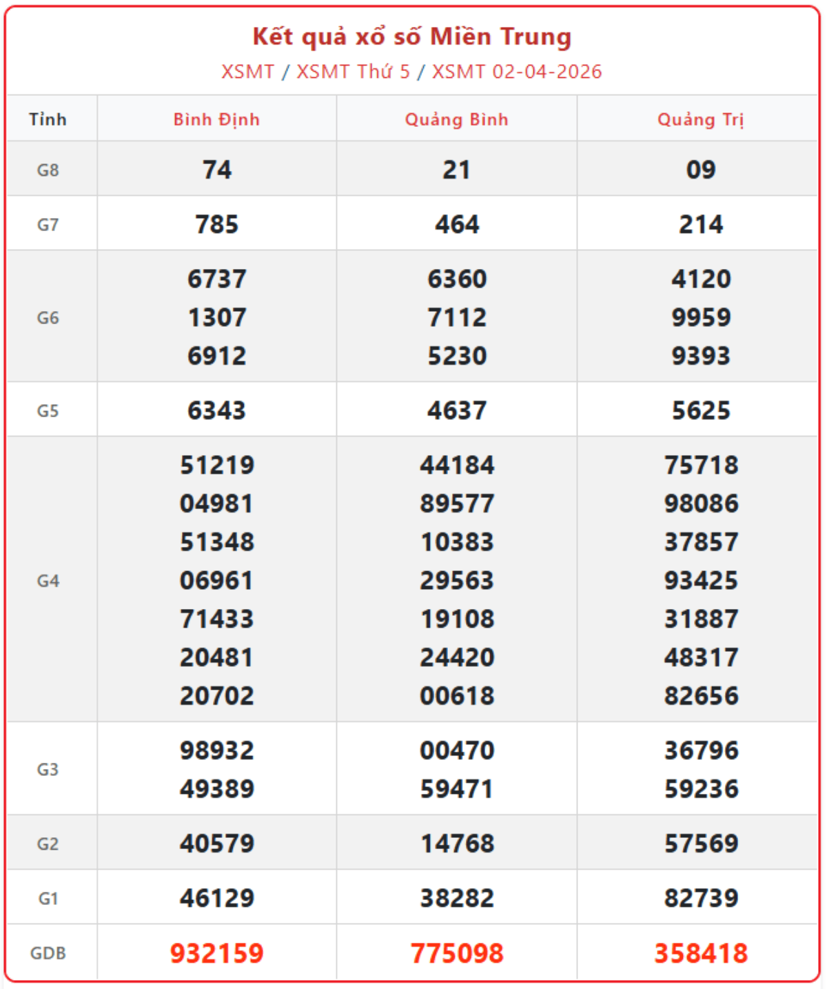 Kết quả xổ số miền Trung ngày 2/4/2026, cập nhật KQXSMT thứ 5 hàng tuần đầy đủ, chính xác nhất.