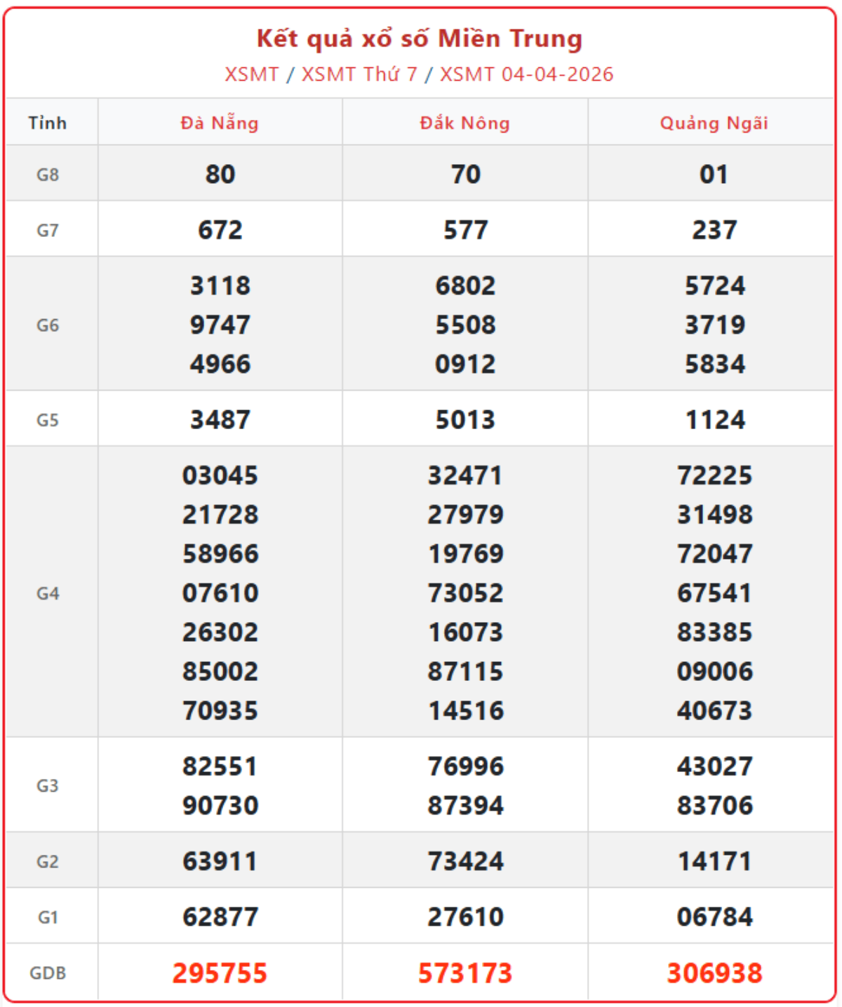 Kết quả xổ số miền Trung ngày 4/4/2026, cập nhật KQXSMT thứ 7 hàng tuần đầy đủ, chính xác nhất.