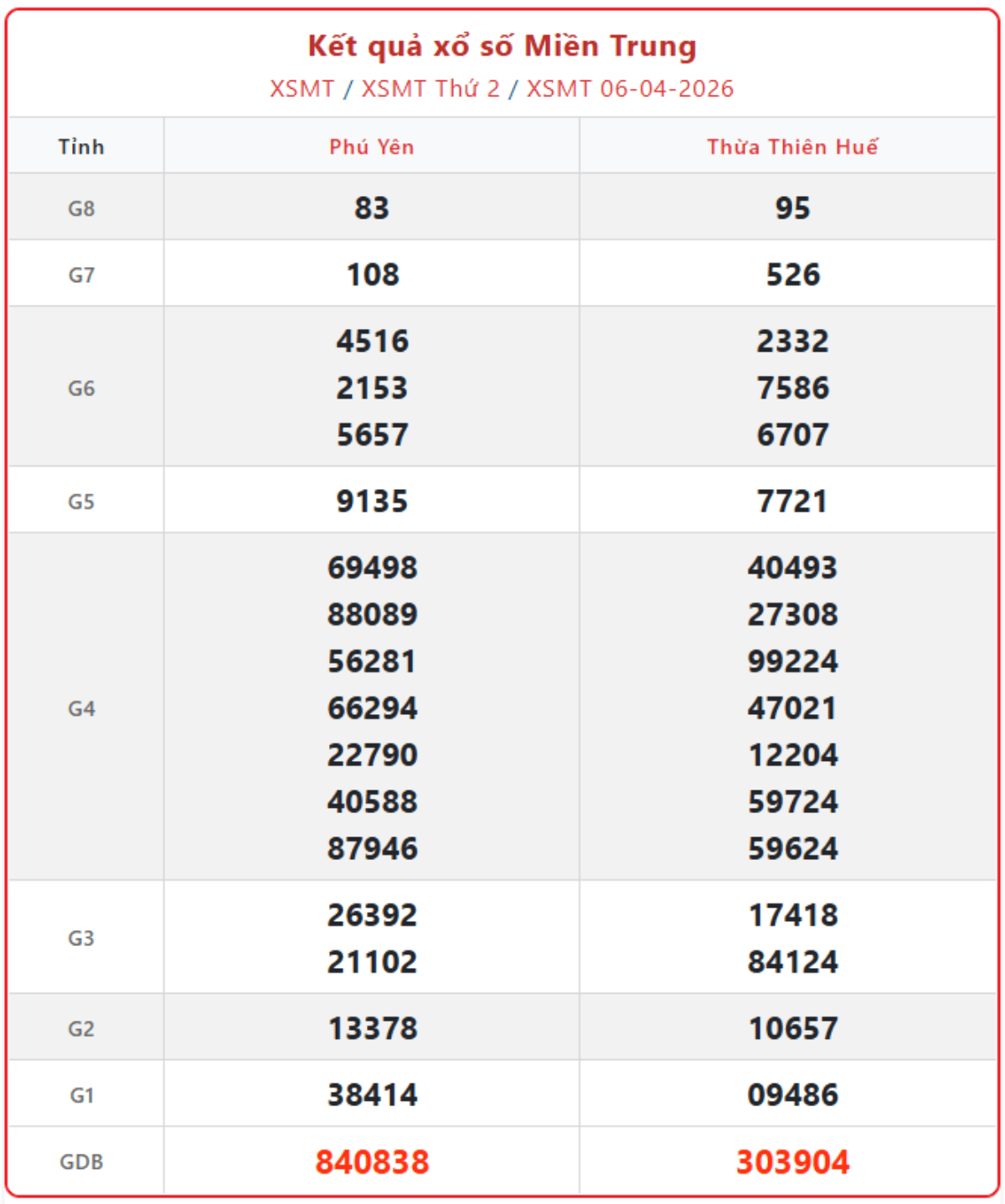 Kết quả xổ số miền Trung ngày 6/4/2026, cập nhật KQXSMT thứ 2 hàng tuần đầy đủ, chính xác nhất.