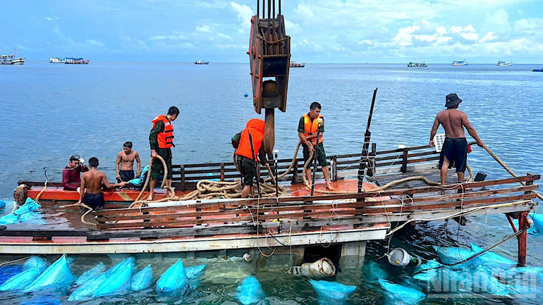Đồn Biên phòng Hòn Chuối phối hợp cùng ngư dân sử dụng cẩu 80 tấn trục vớt thành công tàu cá bị chìm.