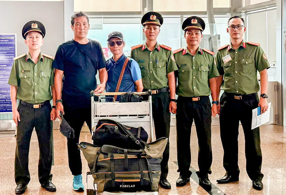 Phòng Quản lý xuất nhập cảnh Công an tỉnh Khánh Hòa làm các thủ tục trục xuất Omokeev Ulukbek (thứ hai từ trái qua) ở cảng hàng không quốc tế Cam Ranh. Ảnh: XH