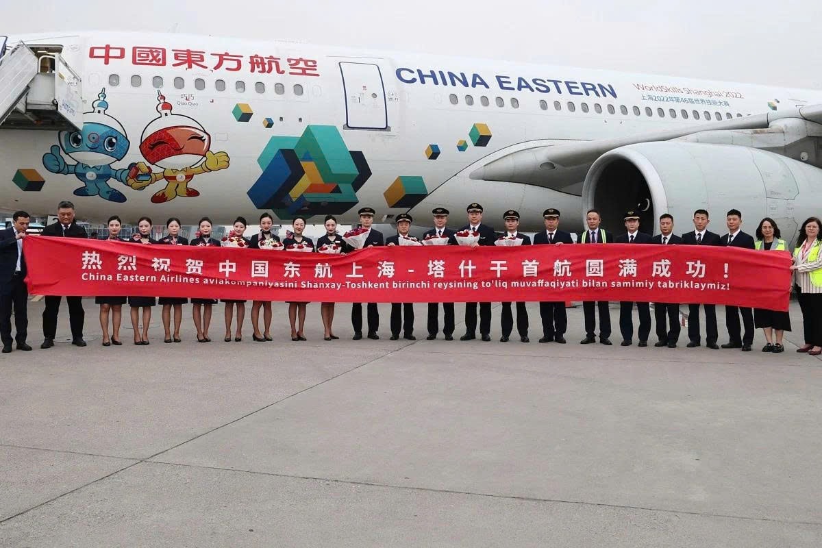 Nhân viên mặt đất và phi hành đoàn China Eastern Airlines chụp ảnh tại lễ khai trương đường bay thẳng Thượng Hải - Tashkent, Uzbekistan, tháng 3. Ảnh: Tân Hoa Xã