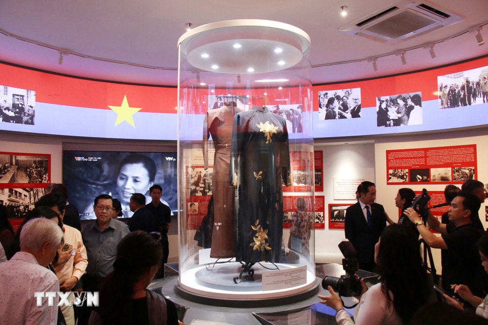 Những chiếc áo dài bà Nguyễn Thị Bình từng mặc được trưng bày giới thiệu dịp này. Ảnh: TTXVN