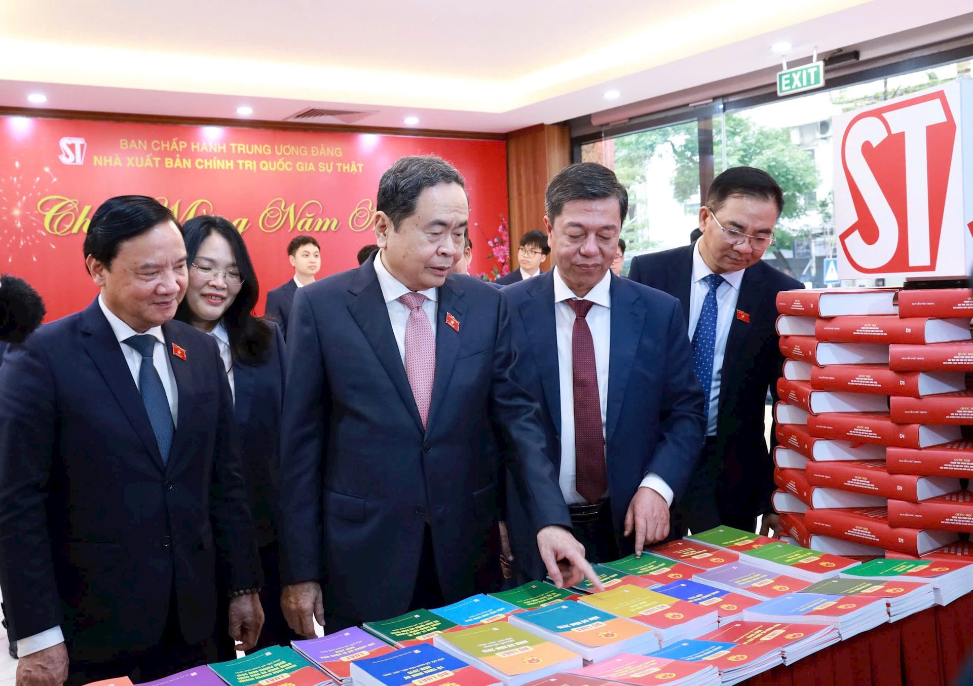 Ủy viên Bộ Chính trị, Chủ tịch Quốc hội Trần Thanh Mẫn và các đại biểu tham quan trưng bày các ấn phẩm của Nhà Xuất bản Chính trị quốc gia Sự thật nhân lễ giới thiệu bộ sách luật được thông qua tại Kỳ họp thứ 10, Quốc hội khóa XV. Ảnh: M.Chi