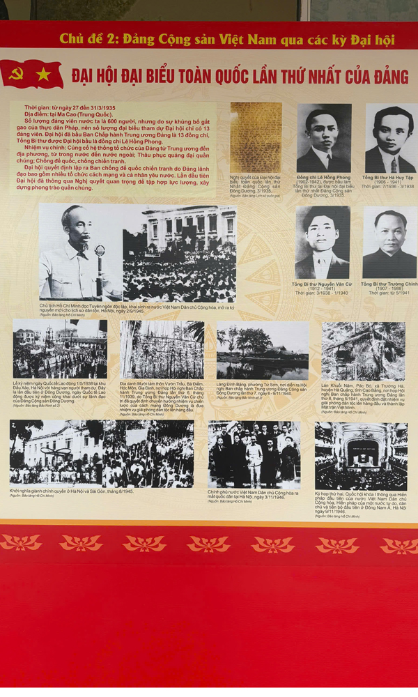 Chủ đề 2: "Đảng Cộng sản Việt Nam qua các kỳ Đại hội" khắc họa quá trình phát triển liên tục, vững mạnh của Đảng qua 14 kỳ Đại hội. Chủ đề làm nổi bật những chủ trương, đường lối đúng đắn của Đảng trong từng giai đoạn lịch sử, từ đấu tranh giành độc lập dân tộc, thống nhất đất nước đến công cuộc đổi mới, xây dựng và bảo vệ Tổ quốc trong bối cảnh hội nhập quốc tế sâu rộng hiện nay.