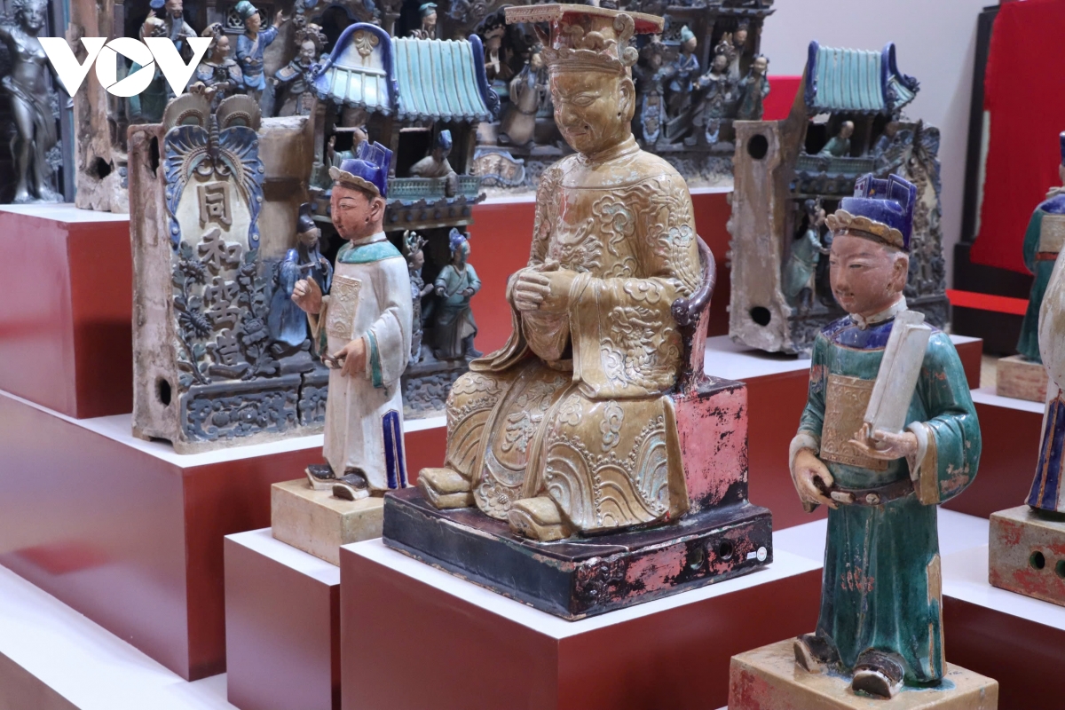 50 hiện vật tiêu biểu được trưng bày, chia thành 4 nhóm chủ đề gồm: tượng thờ Phật giáo như Phật, Bồ Tát, La Hán, Diêm Vương, với tư thế và trang phục tuần thủ nghiêm ngặt quy tắc đồ tượng học Phật giáo; tượng thờ đạo giáo tiêu biểu là bộ Tam Quan Đại Đế; tượng thờ dân gian gồm các pho tượng đặc sắc như Ngọc Hoàng, Phúc Đức Thổ Địa, Quan Thánh Đế Quân, Chúa Tiên Nương Nương... mang dậm phong cách tạo hình dân gian; tượng trang trí kiến trúc bao gồm tượng các nhân vật Đạo giáo và dân gian như Bát Tiên, Ông Nhật - Bà Nguyệt, …cùng các quần thể tiểu tượng thường được gắn trên mái đình, chùa, miếu, hội quán của cả người Việt lẫn người Hoa.