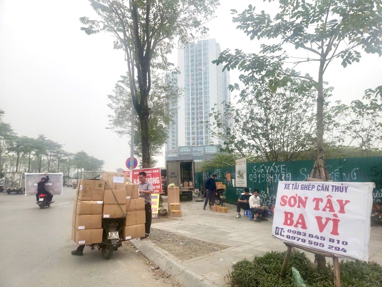 Đáng nói, nhiều xe tải dừng, đỗ ngay sát làn xe đang lưu thông để mở thùng, bốc xếp hàng trực tiếp, không có rào chắn hay biện pháp bảo đảm an toàn giao thông. Các công nhân bốc xếp đứng, ngồi tràn lan trên vỉa hè, thậm chí dưới lòng đường, vừa phân loại vừa chờ nhận hàng. Một số xe máy được cải tạo, chằng buộc hàng hóa cao quá đầu người, di chuyển cồng kềnh, tiềm ẩn nguy cơ mất an toàn.