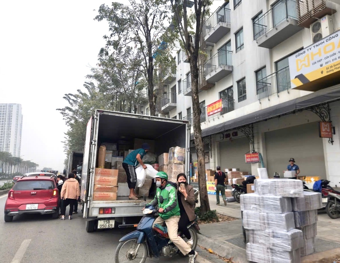 Theo ghi nhận của phóng viên trong các ngày 6 và 7-2, vào nhiều khung giờ, đặc biệt là sáng sớm và cuối buổi chiều, hoạt động trung chuyển, bốc xếp hàng hóa diễn ra khá công khai. Các phương tiện vi phạm rất đa dạng, từ xe tải thùng cỡ lớn, xe bán tải, xe tải nhẹ cho đến xe máy chở hàng cồng kềnh… liên tục tập kết dọc tuyến phố để vận chuyển hàng hóa được đóng trong thùng carton, bao tải, bọc ni lông… Hàng hóa được bày la liệt, xếp chồng lên nhau ngay trên vỉa hè, lề đường để thuận tiện cho việc bốc xếp lên xe.