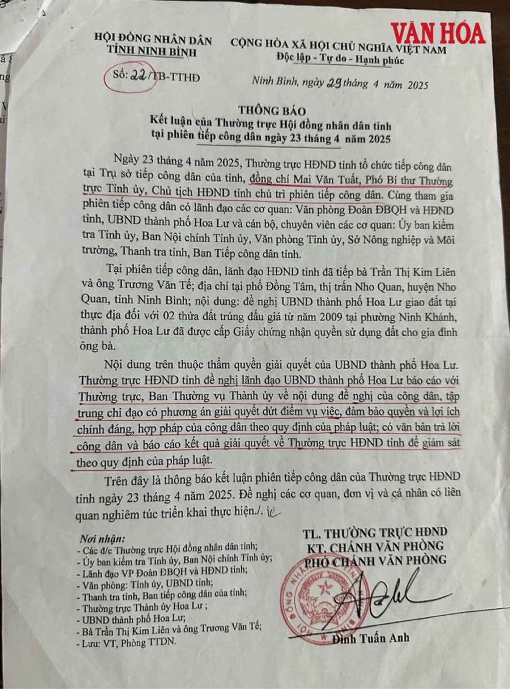 Ngày 29.4.2025, HĐND tỉnh Ninh Bình có Thông báo số 22/TB – TTHĐ về Kết luận Thường trực HĐND tỉnh tại phiên tiếp công dân là bà Trần Thị Kim Liên. Trong đó ghi rõ: Nội dung trên thuộc thẩm quyền giải quyết của UBND thành phố Hoa Lư. Thường trực HĐND tỉnh đề nghị lãnh đạo UBND TP. Hoa Lư báo cáo với Thường trực, Ban Thường vụ Thành ủy về nội dung đề nghị của công dân, tập trung chỉ đạo có phương án giải quyết dứt điểm vụ việc, đảm bảo quyền và lợi ích chính đáng, hợp pháp của công dân theo quy định của pháp luật. Có văn bản trả lời công dân và báo cáo kết quả giải quyết về Thường trực HĐND tỉnh để giám sát theo quy định của pháp luật.